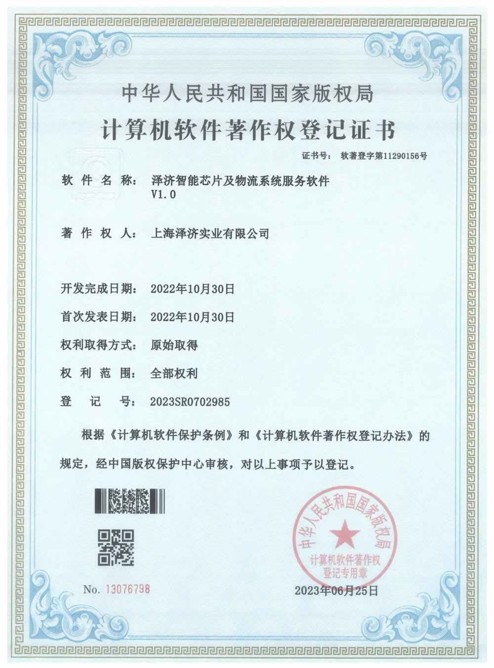 (2023SR0702985)澤濟智能芯片及物流系統服務軟件